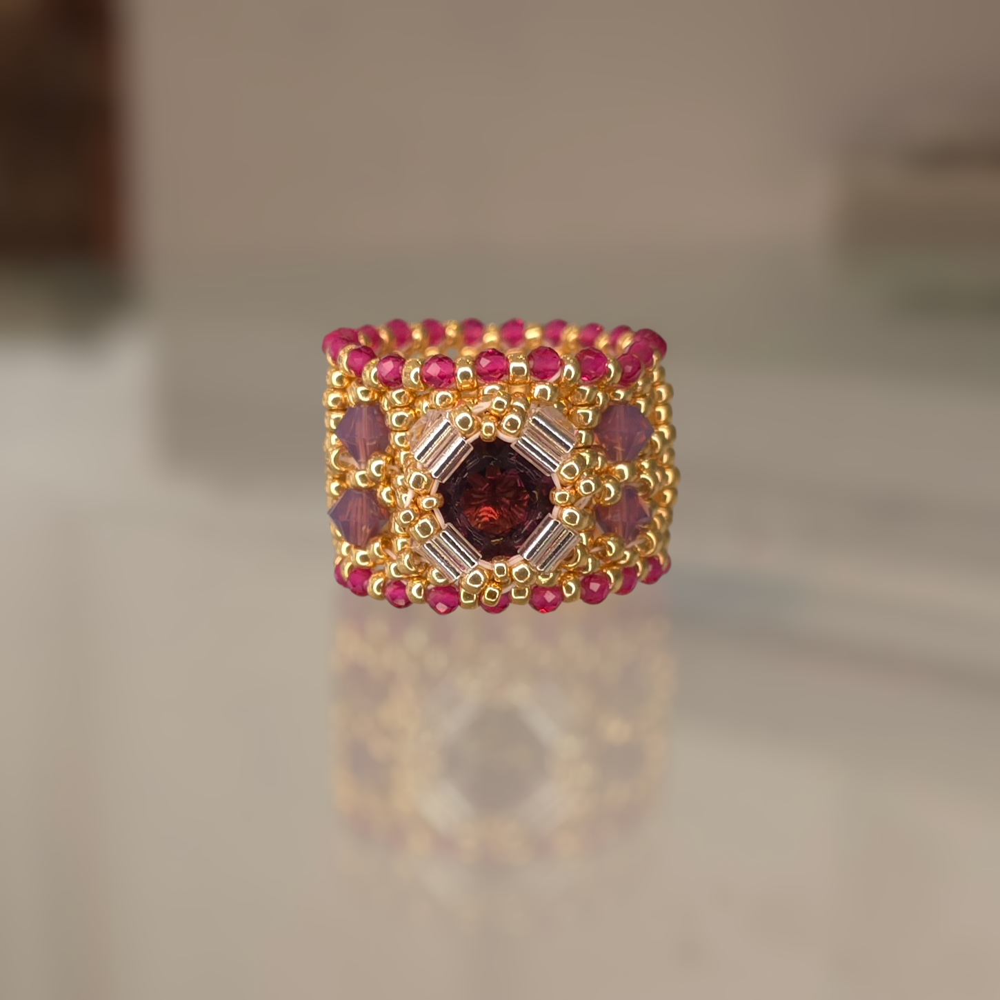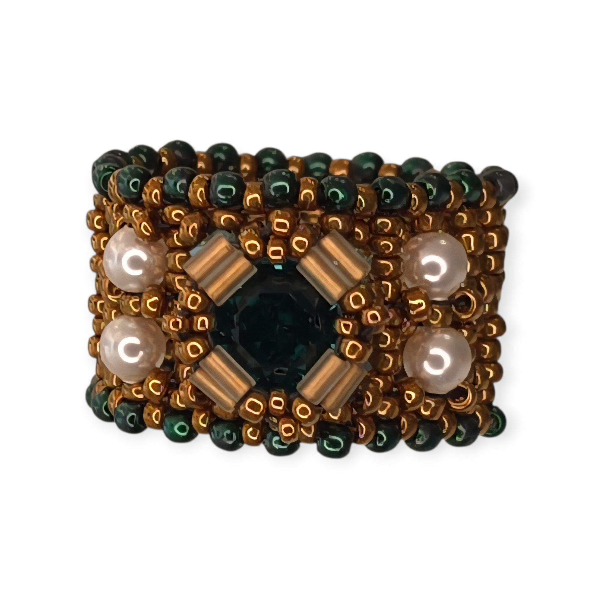 Slip on instant glamour with this handcrafted beaded band ring that demands attention. Featuring lustrous Japanese Miyuki beads paired with sparkling Swarovski chatons, each design shimmers with premium details - Czech Preciosa pearls, Swarovski crystals and pearls, fire-polished crystals or glass beads, and delicate pearl accents. Choose from three stunning finishes: silver, gold, or bronze. Whether you're making a solo statement or stacking for maximum impact, this ring transforms you into the main character of any room. Beautifully bold, undeniably fancy, and entirely handmade to celebrate your unique style.