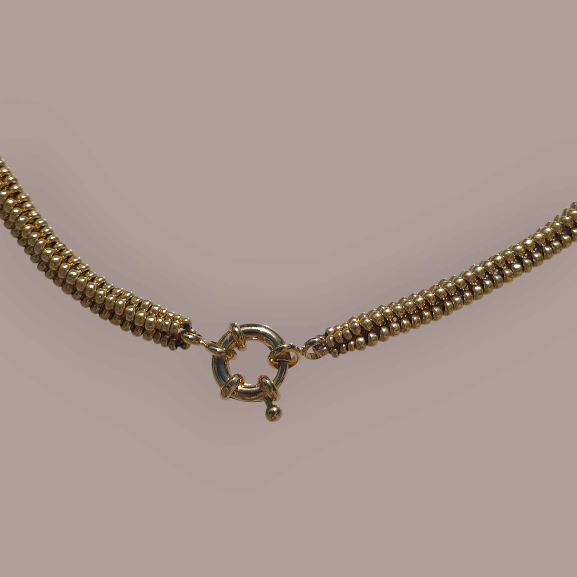 Halskette aus galvanisierten japanischen Miyuki-Perlen mit Duracoat-Beschichtung und goldfarbenem Messing-Federringverschluss. Erhältlich in zwei Längen: 48 cm und 42 cm.
