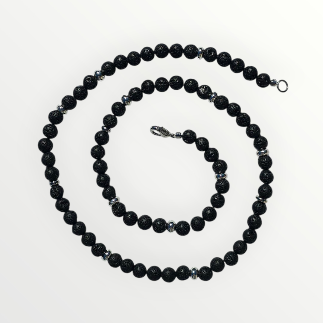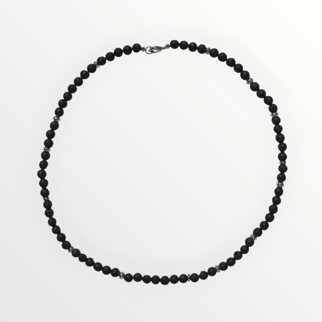 Die Halskette besteht aus 6 mm großen Lavasteinen und Edelstahl-Zwischenstücken mit einer kleinen Drehung und ist mit einem Edelstahl-Karabinerverschluss versehen. Die Gesamtlänge beträgt 52 cm.