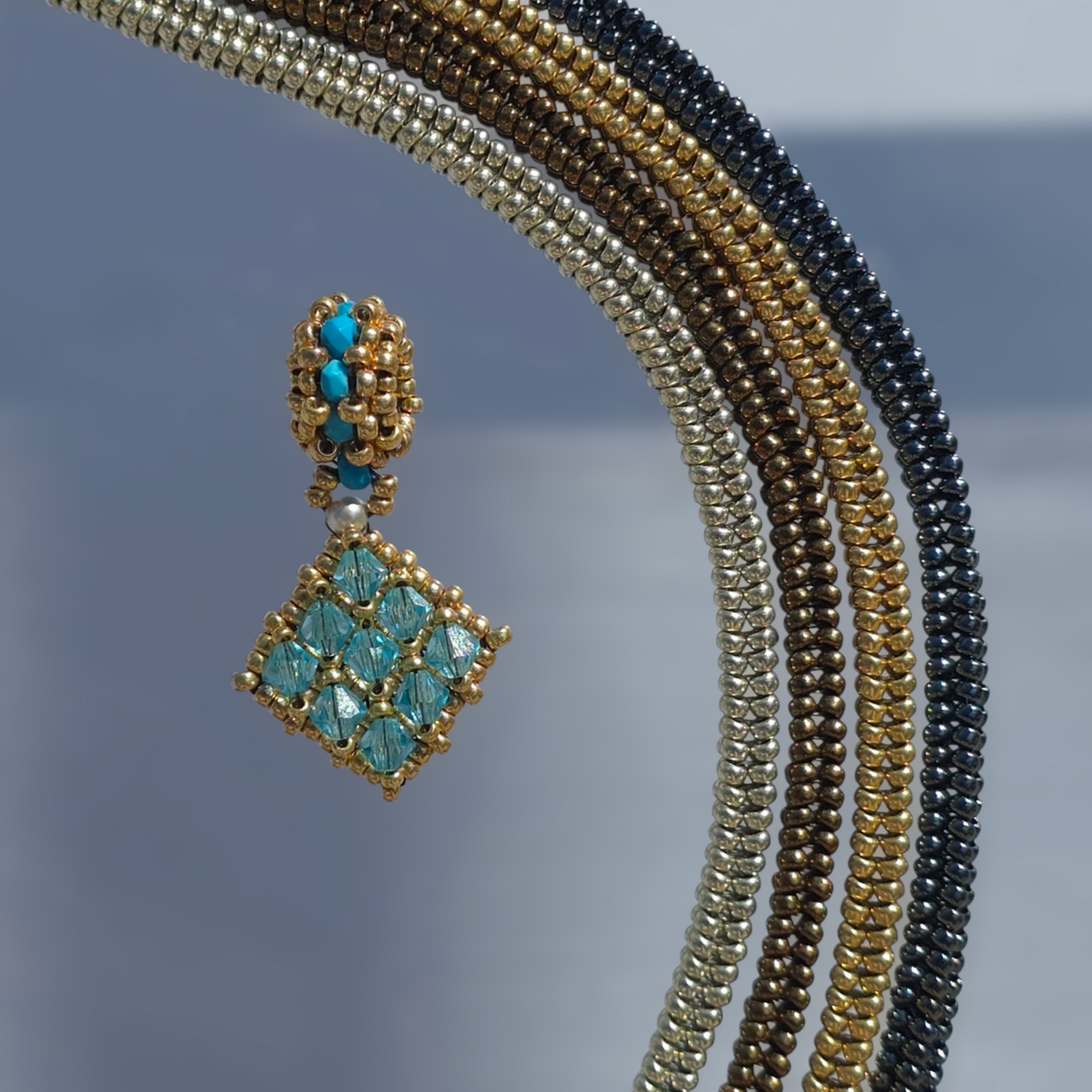 Dieser Anhänger ist mit Swarovski-Kristallen in zwei Farben und japanischen Miyuki-Perlen verziert und mit türkisfarbenen Halbedelsteinen besetzt. Er ist 2 x 2 cm groß, die Gesamtlänge inklusive Kettenöse beträgt ca. 4 cm.