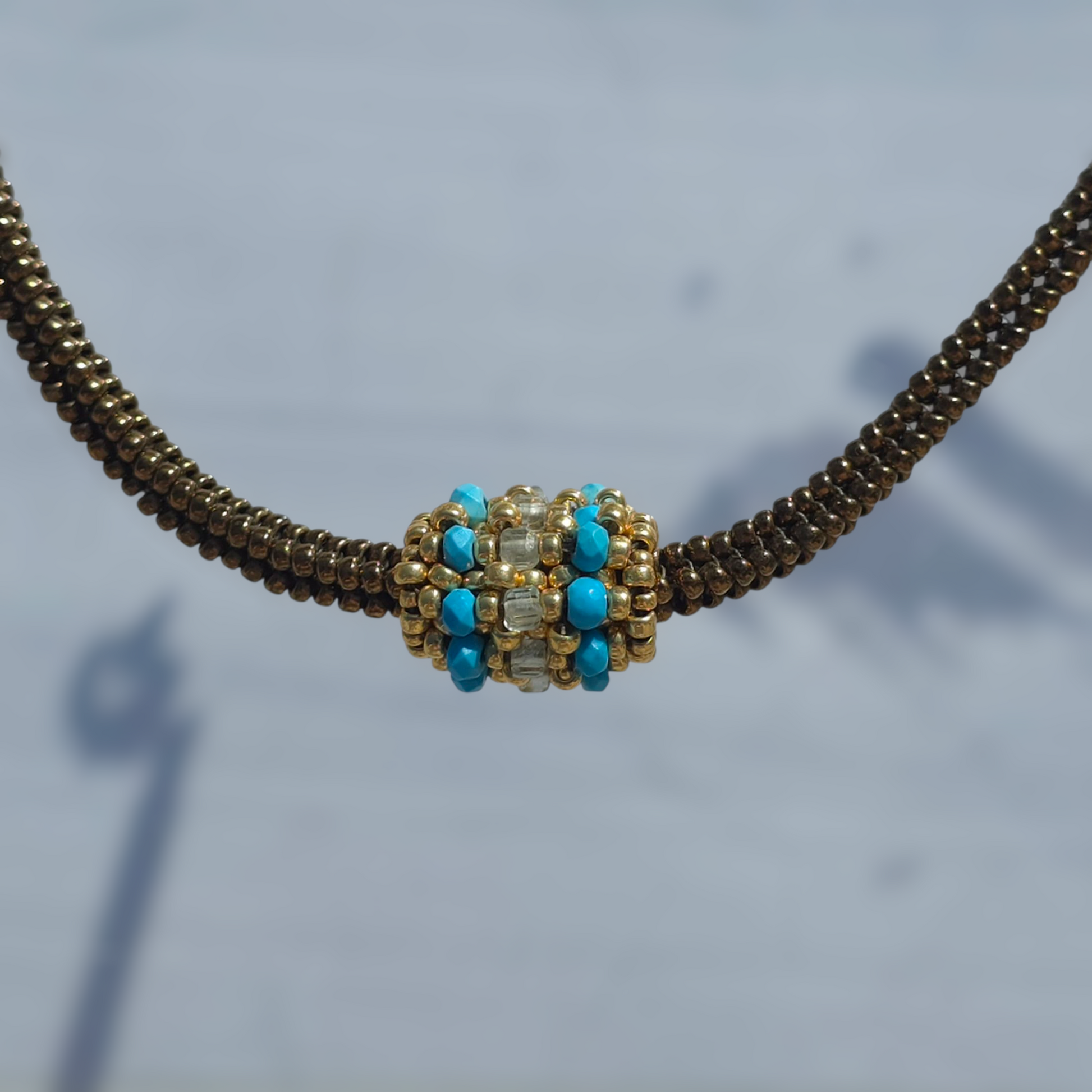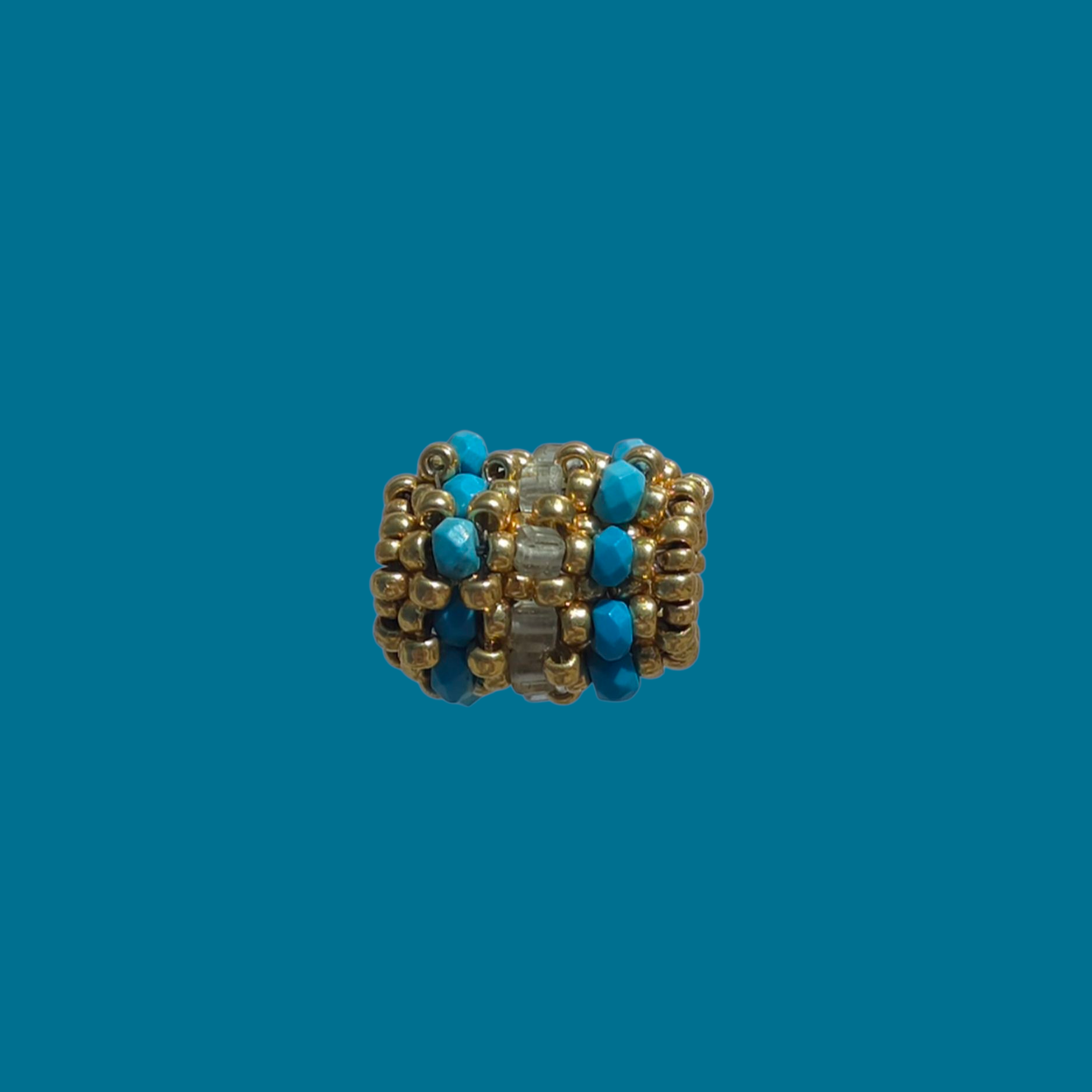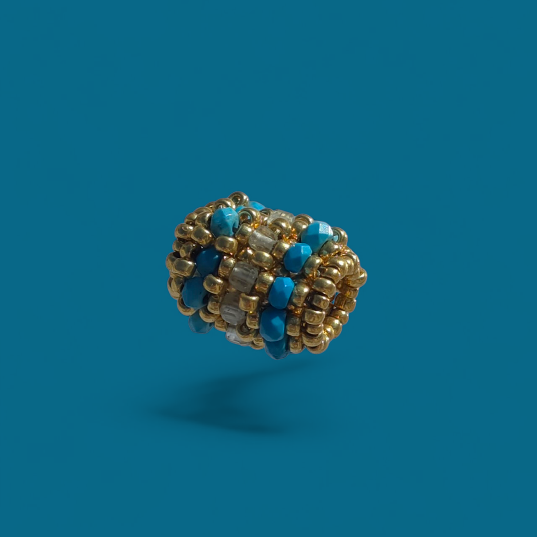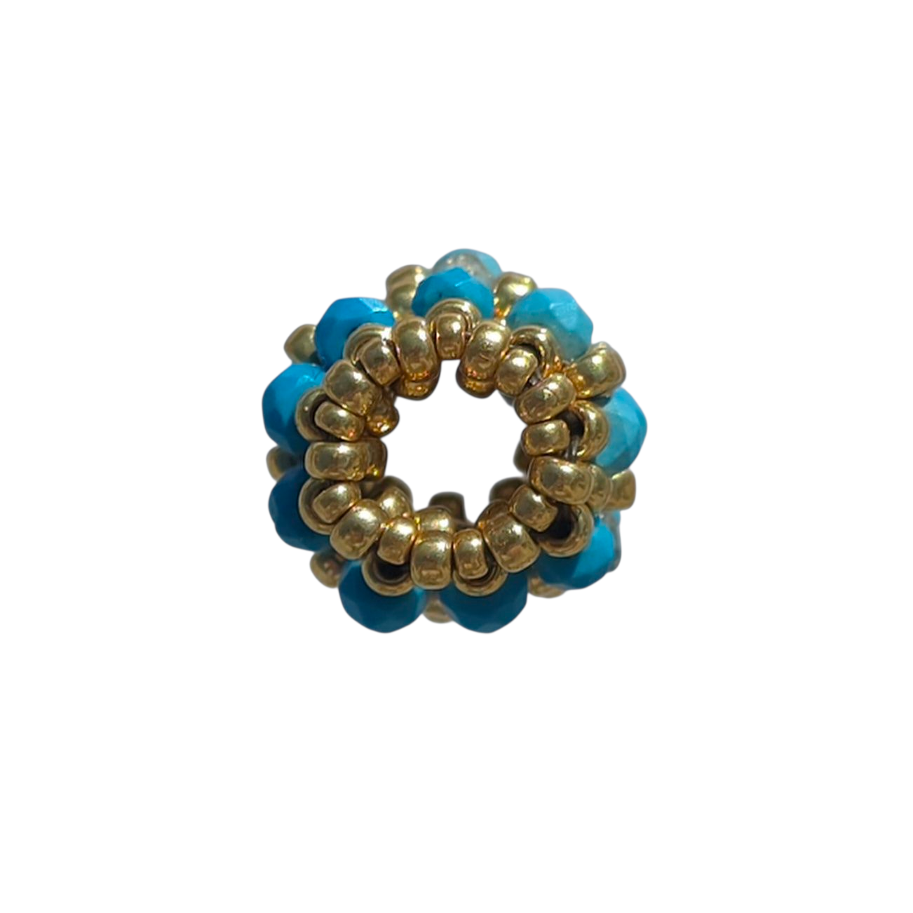 Anhänger aus japanischen Miyuki-Duracoat-Perlen mit galvanisiertem Goldfinish sowie 2 mm großen Türkis- und Aquamarin-Halbedelsteinen. Größe: 1,5 x 1 cm