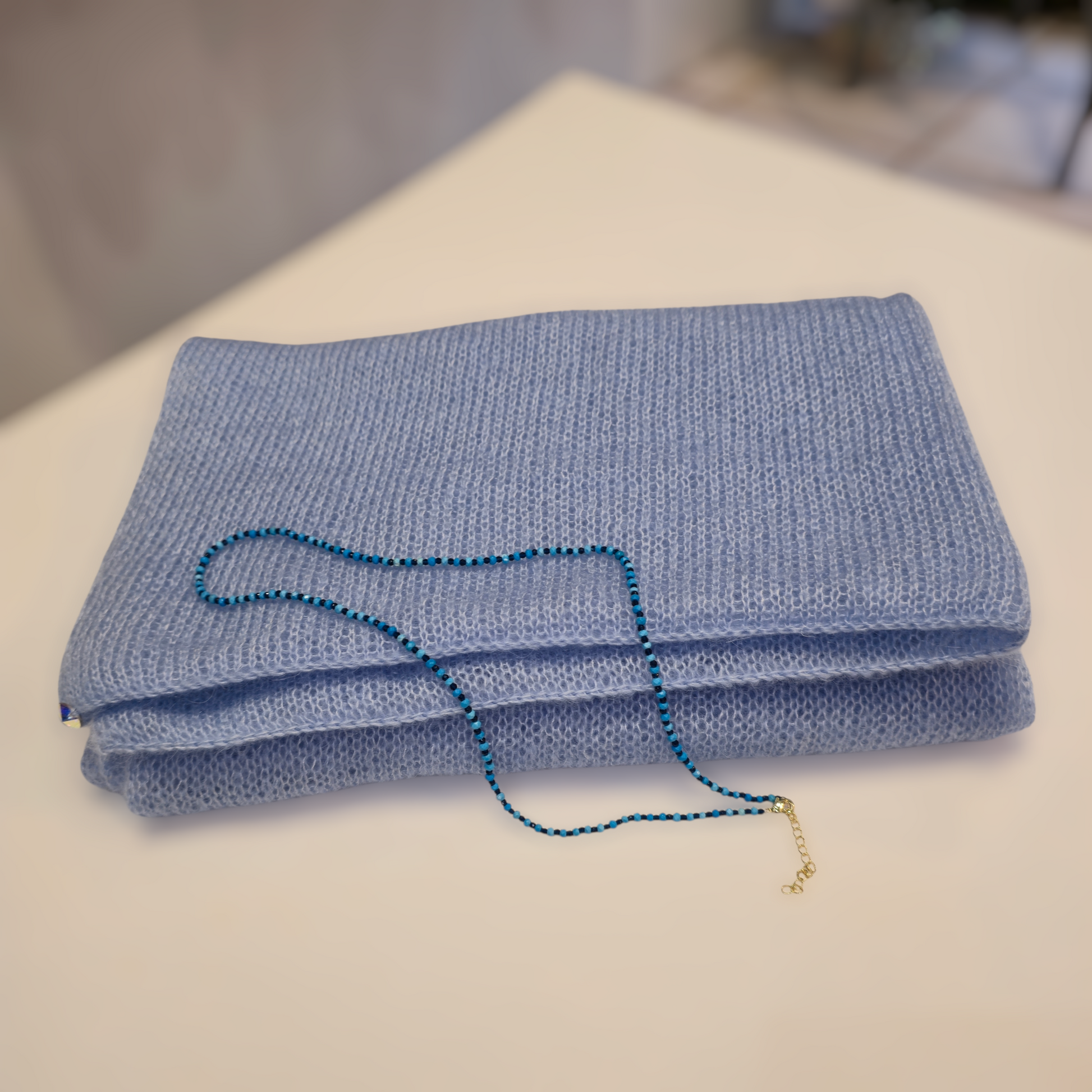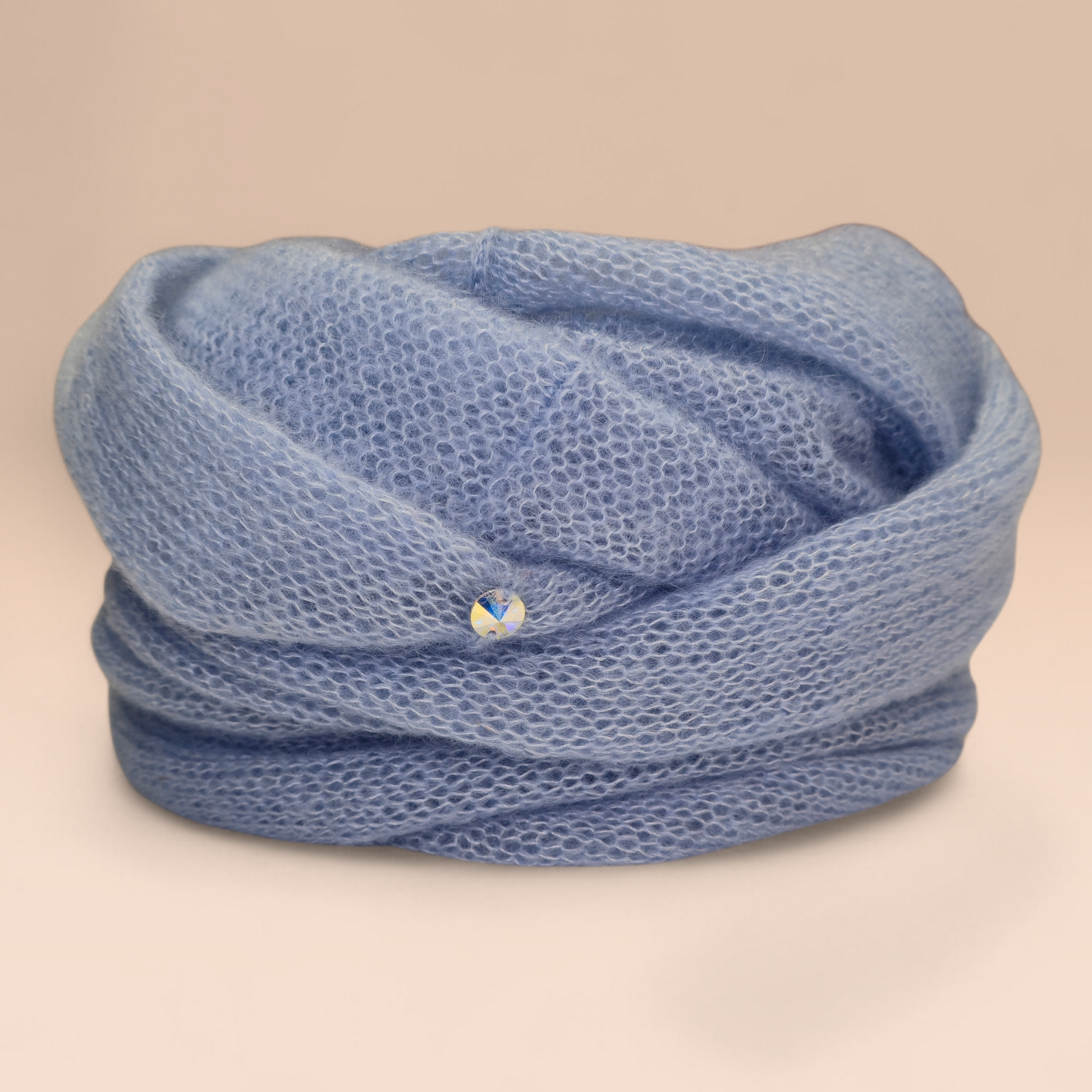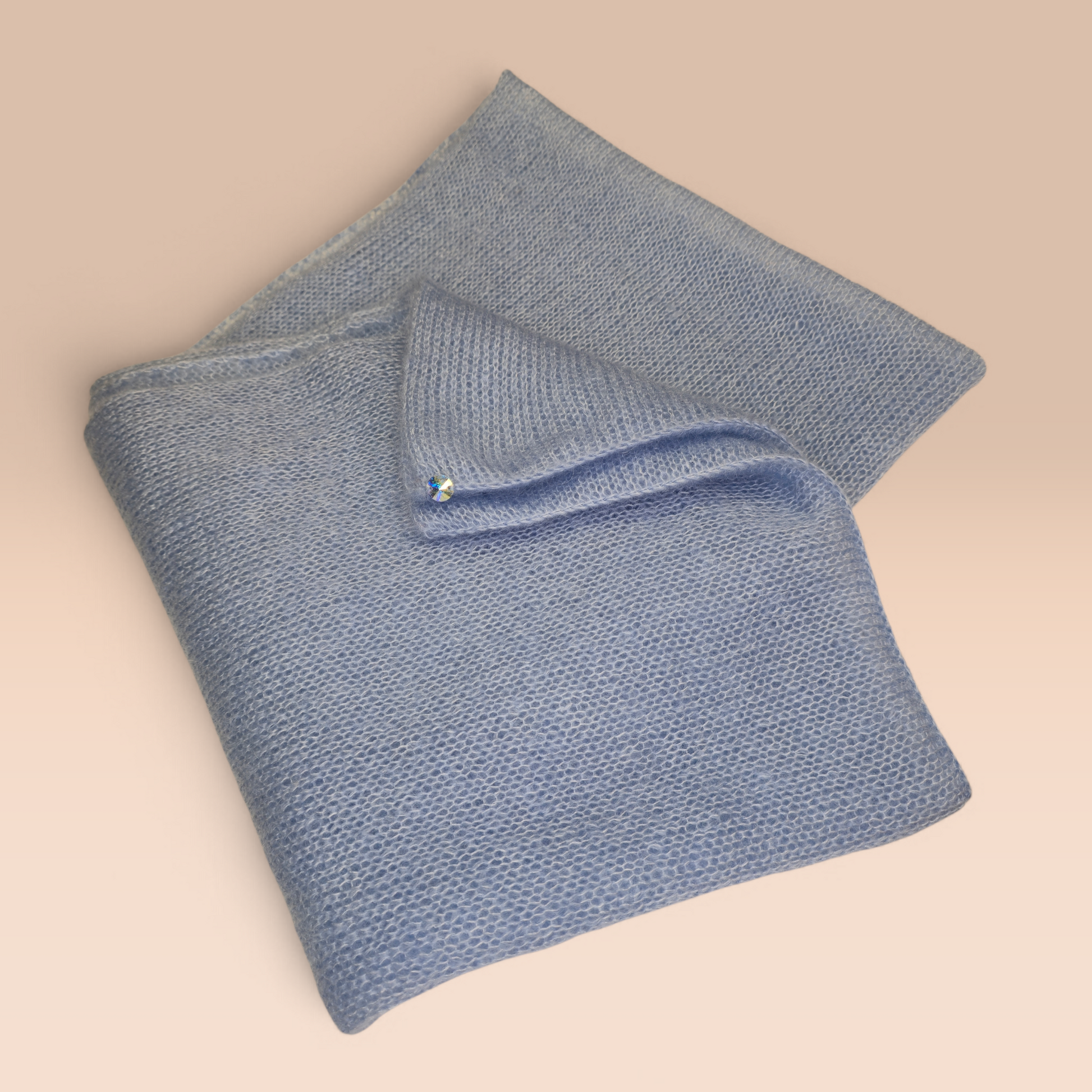 Η λεπτή υφή του μεταξωτού μοχέρ δημιουργεί ένα απαλό φωτοστέφανο και απαλή λάμψη, κάνοντας το κασκόλ να είναι αέρινο αλλά και ζεστό. Ως διακριτική πινελιά, κάθε κασκόλ διαθέτει ένα μικρό λαμπερό κουμπί, προσθέτοντας μια εκλεπτυσμένη λεπτομέρεια χωρίς να υπερισχύει του σχεδίου.
