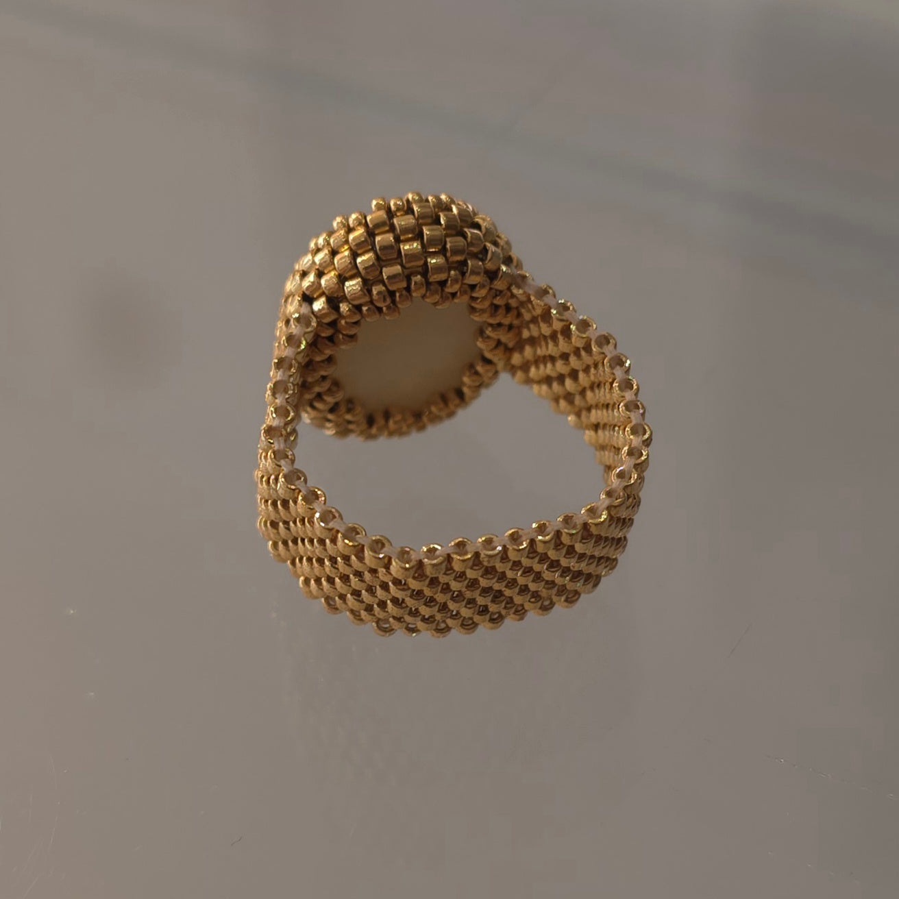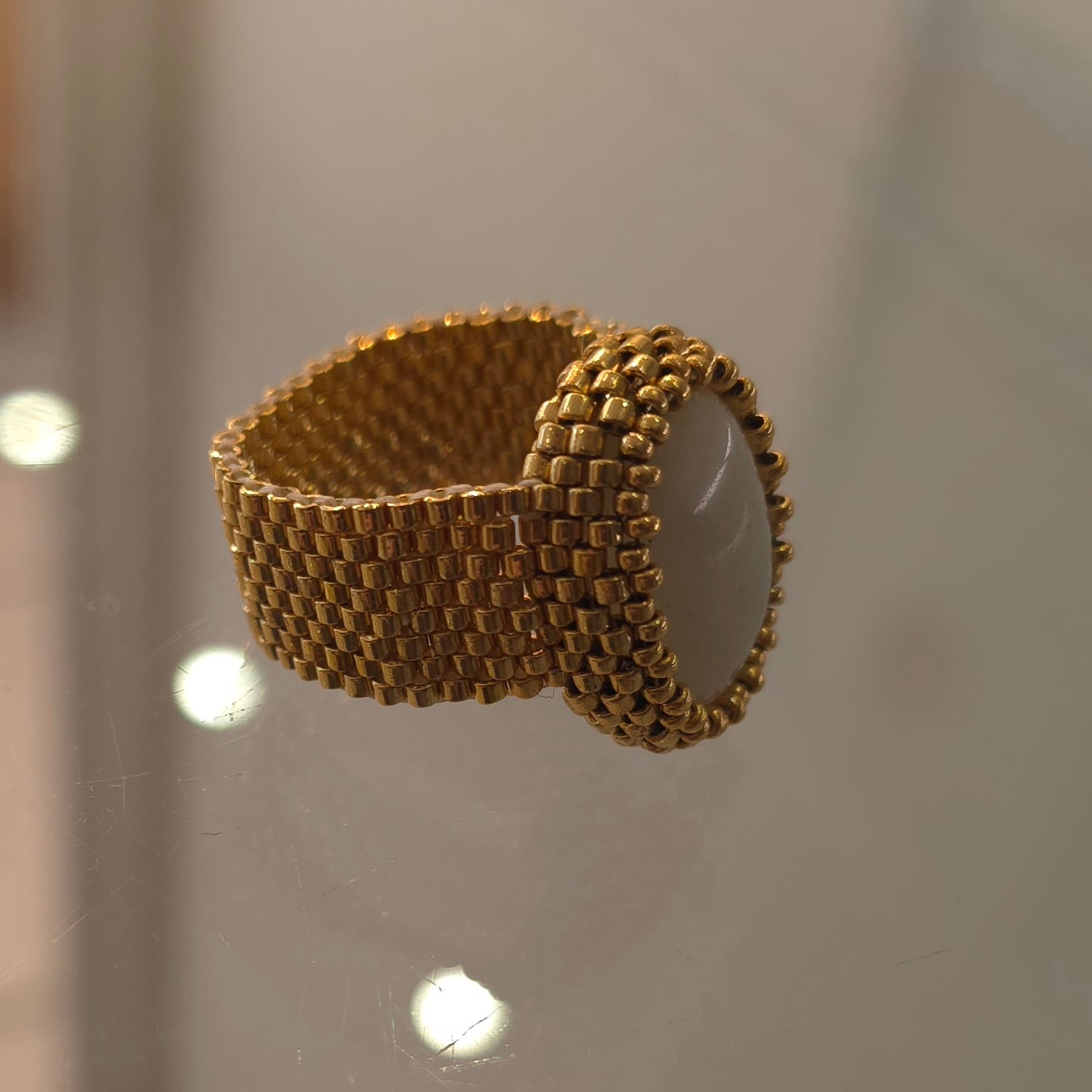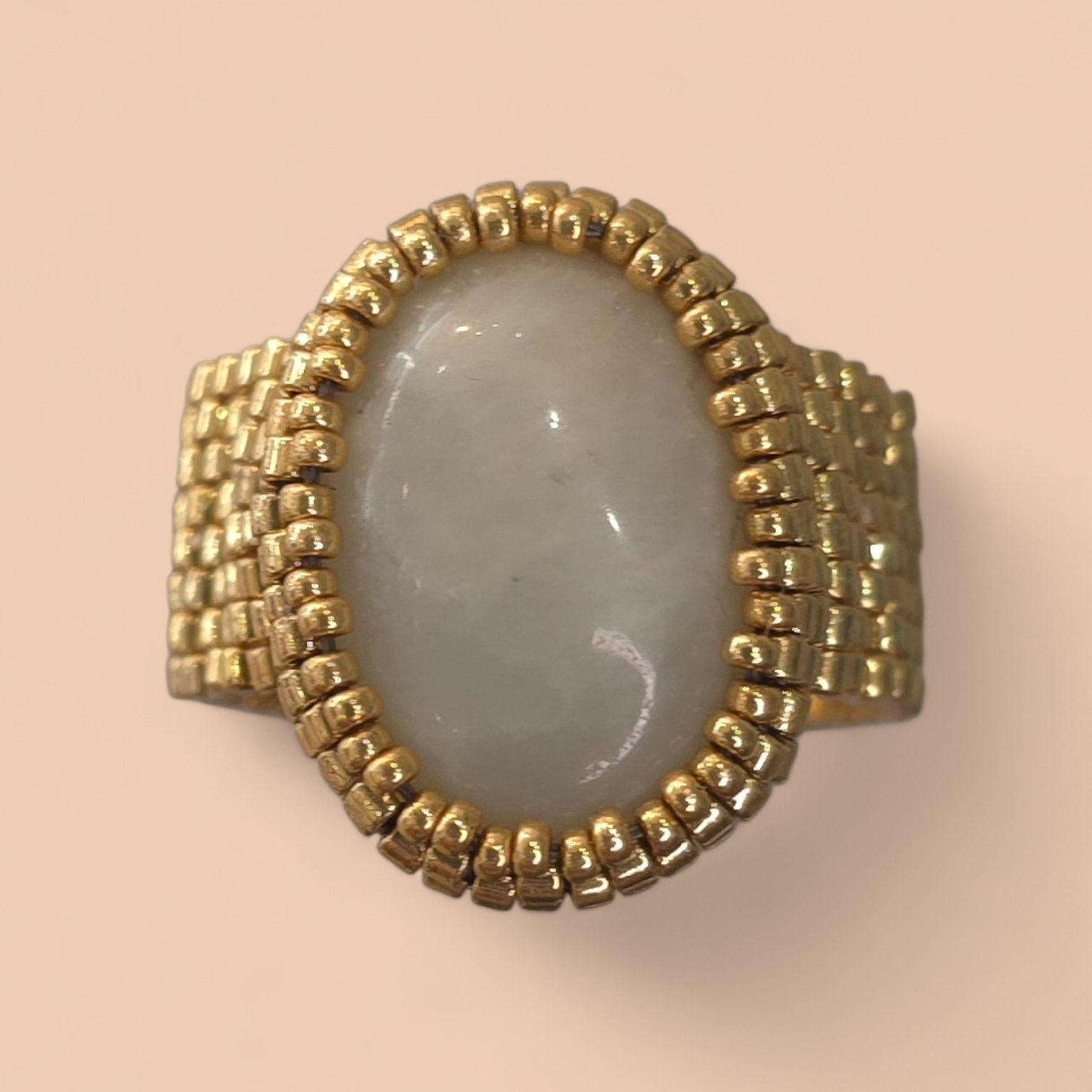 This handmade beaded ring features a natural amazonite cabochon stone set with premium duracoat galvanized Miyuki gold Delica beads. Carefully crafted for durability and long-lasting shine, the wider beaded band offers both comfort and a bold, elegant look. Each ring is one of a kind, highlighting the soft, calming tones of amazonite and the precision of Japanese seed beads. Perfect for lovers of handmade jewelry and natural gemstone accessories.