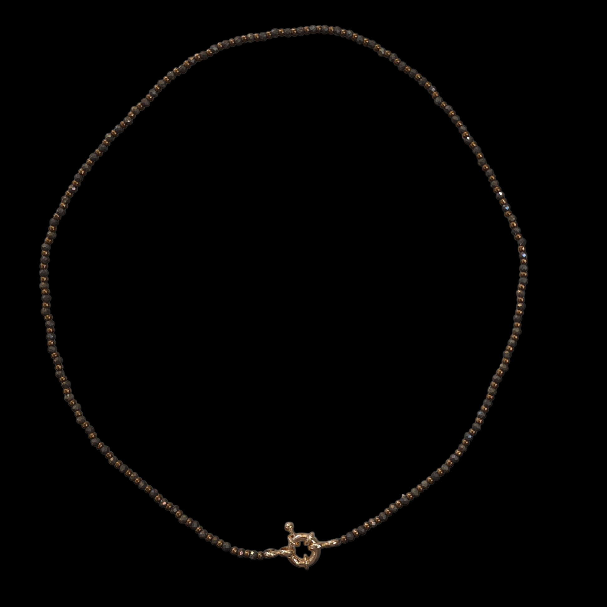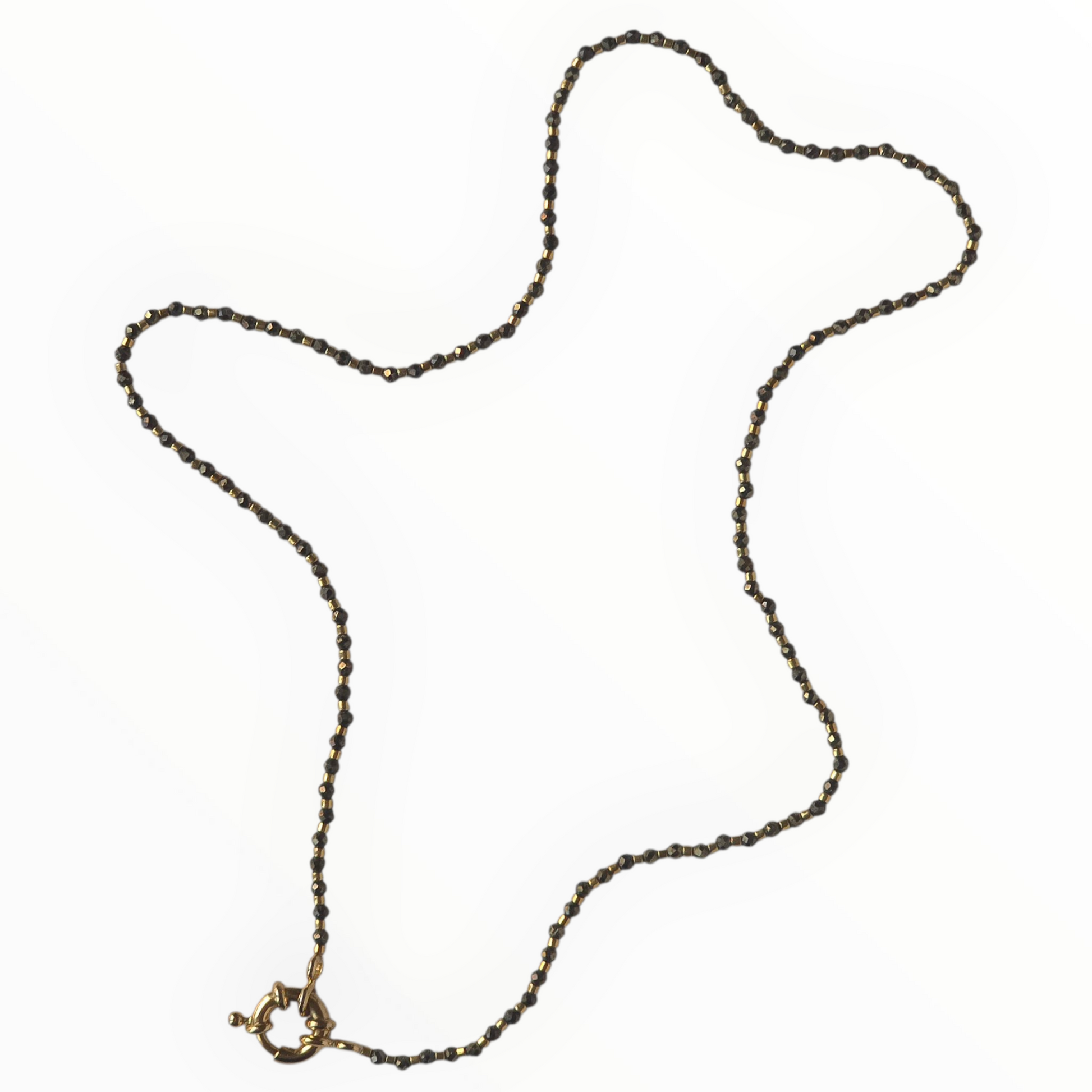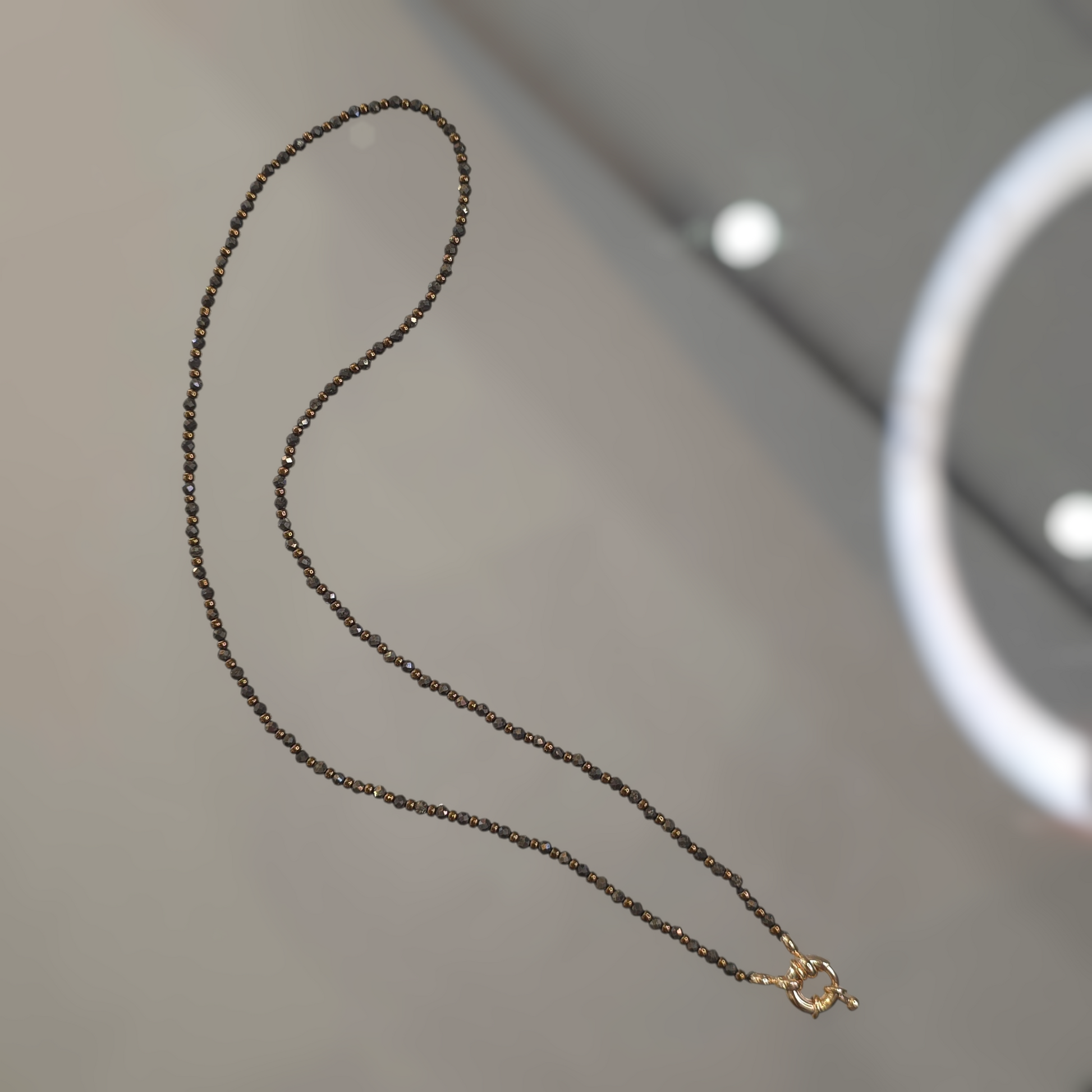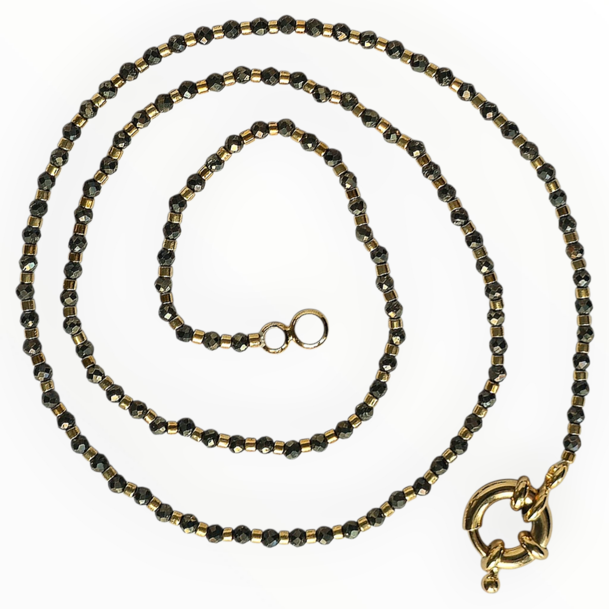 Necklace made with 2mm faceted pyrite stones and Japanese delica duracoat galvanized gold or metallic bronze color beads. Product finished with brass 18k gold plated spring ring clasp. Length is 41cm