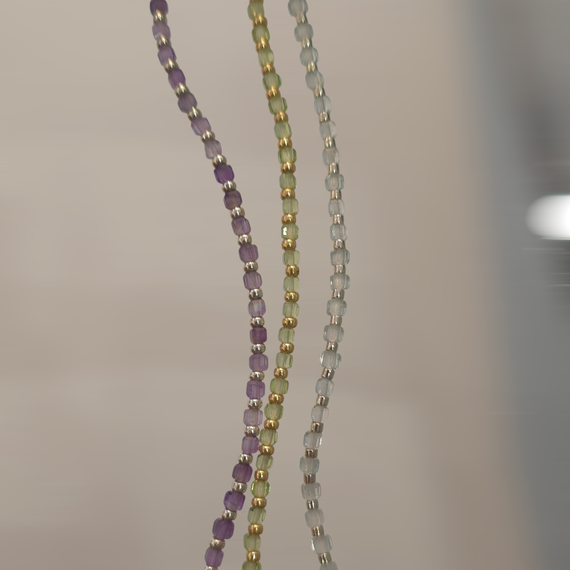 Keep your outfit fun with this lime green beaded necklace! Composed with 2mm diameter peridot stone and Japanese Miyuki beads, finished off with a brass spring ring 18K plated clasp, strung on cord, 45.5cm long.